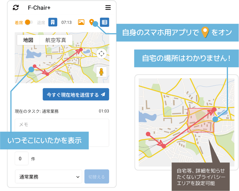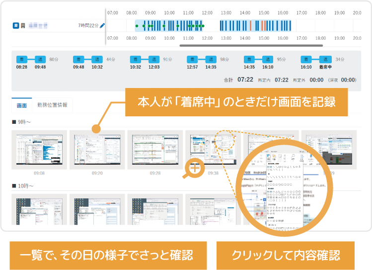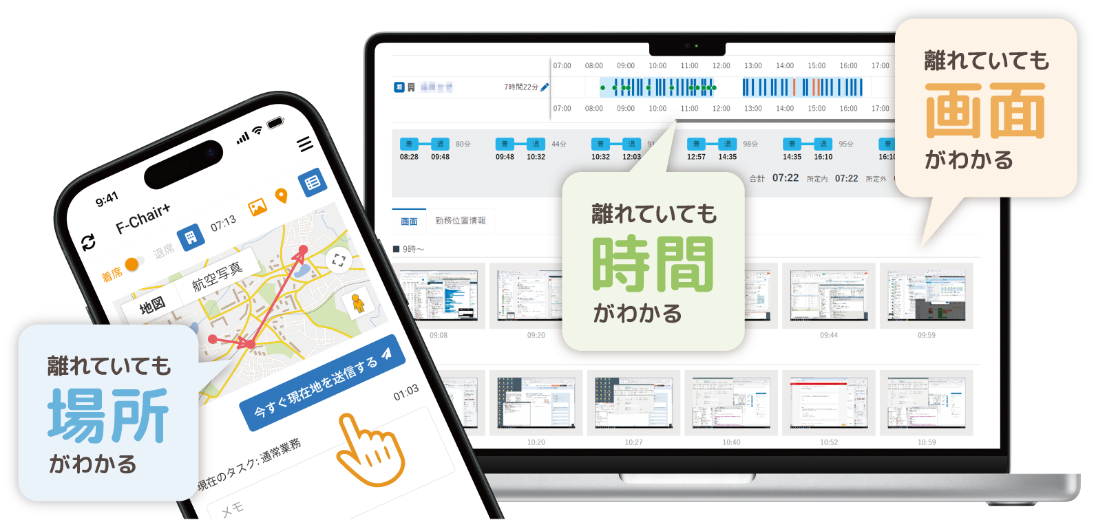 F-Chair+(エフチェアプラス)は「勤務時間の記録」、「パソコン画面の画面キャプチャ記録」、「移動した位置情報の記録」3つの記録から、管理者は、テレワークによる従業員の様子が見えない不安から解消されます。従業員は、さぼりを疑われる不安から解消されます。画面キャプチャの一覧をサッと見るだけで業務内容の様子がわかるので、管理の手間も気になりません。キャプチャ画面の比較機能や、勤務時間集計のグラフ化など、わかりやすさ追求の新機能も続々追加しております。常時使う契約ライセンス数以上にアカウントを登録しておけるので、急な在宅勤務にも対応できます。