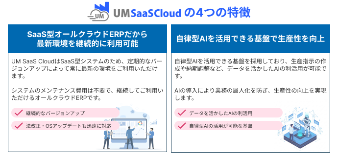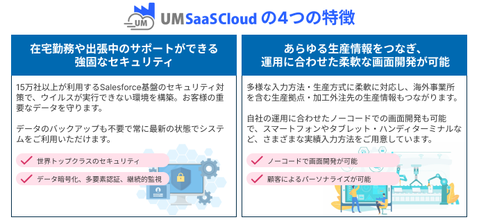 UM SaaS Cloudは、製造業のDXを加速させるクラウドERPです。見積から受発注、生産管理、原価管理までをSaaS型のオールクラウドで実現します。世界的に信頼性の高いSalesforce基盤を採用しているためセキュリティも万全。安心かつスムーズなDXを実現したい製造業様に最適なシステムです。