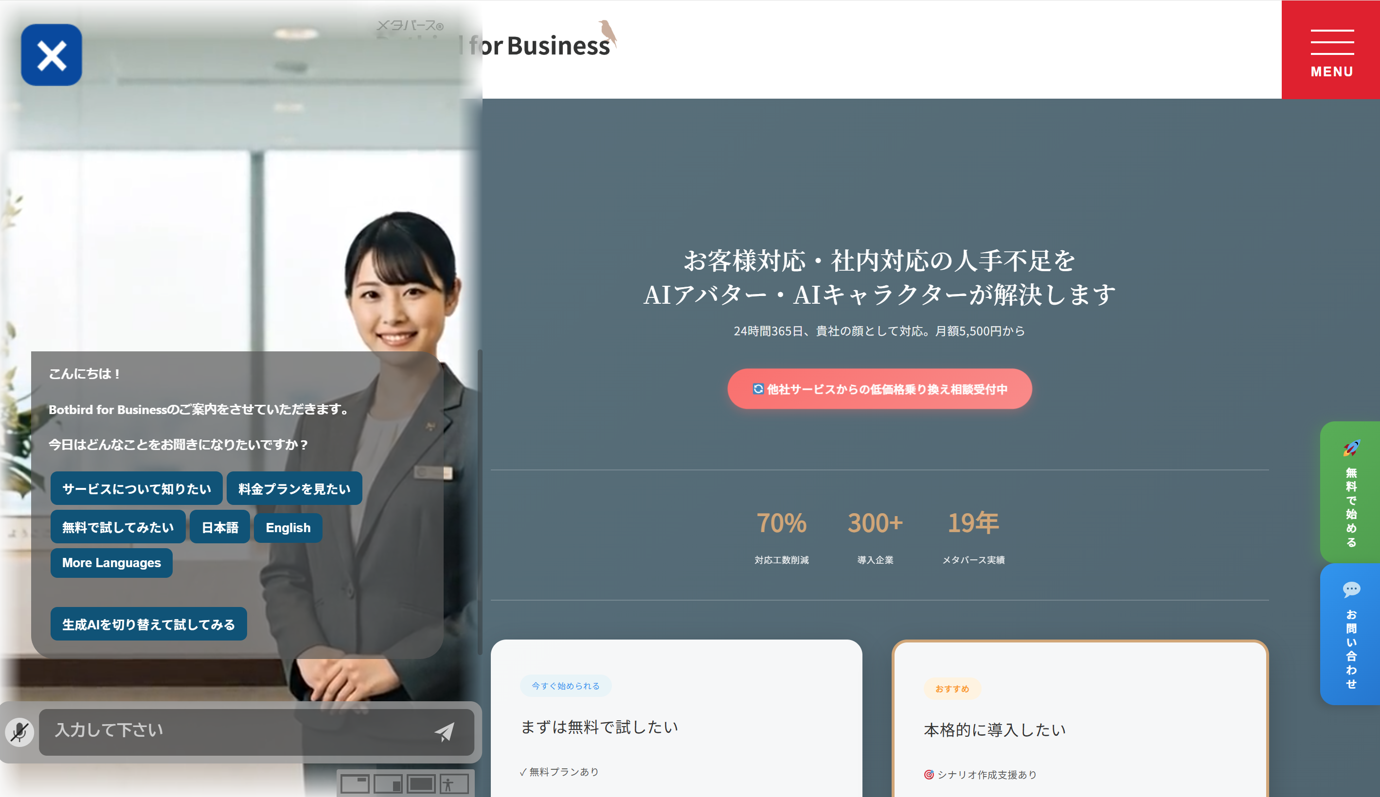 「Botbird for Business」はキャラクターAIチャットボットの作成ツールです。2006年創業から蓄積された技術で、単なるテキストチャットではなく音声会話可能なAIキャラクターを実現。親しみやすいアバターが24時間365日、企業の顔としてお客様対応を行い、対応工数削減を実現しています。月額5,500円から始められる業界最安値級の価格設定で独自データ学習のRAG機能を搭載しています。PDFやOffice文書をアップロードするだけで自動的にFAQを生成し、正確な回答が可能に。既存のQA表やマニュアルをそのまま活用できます。Difyの接続も可能です。