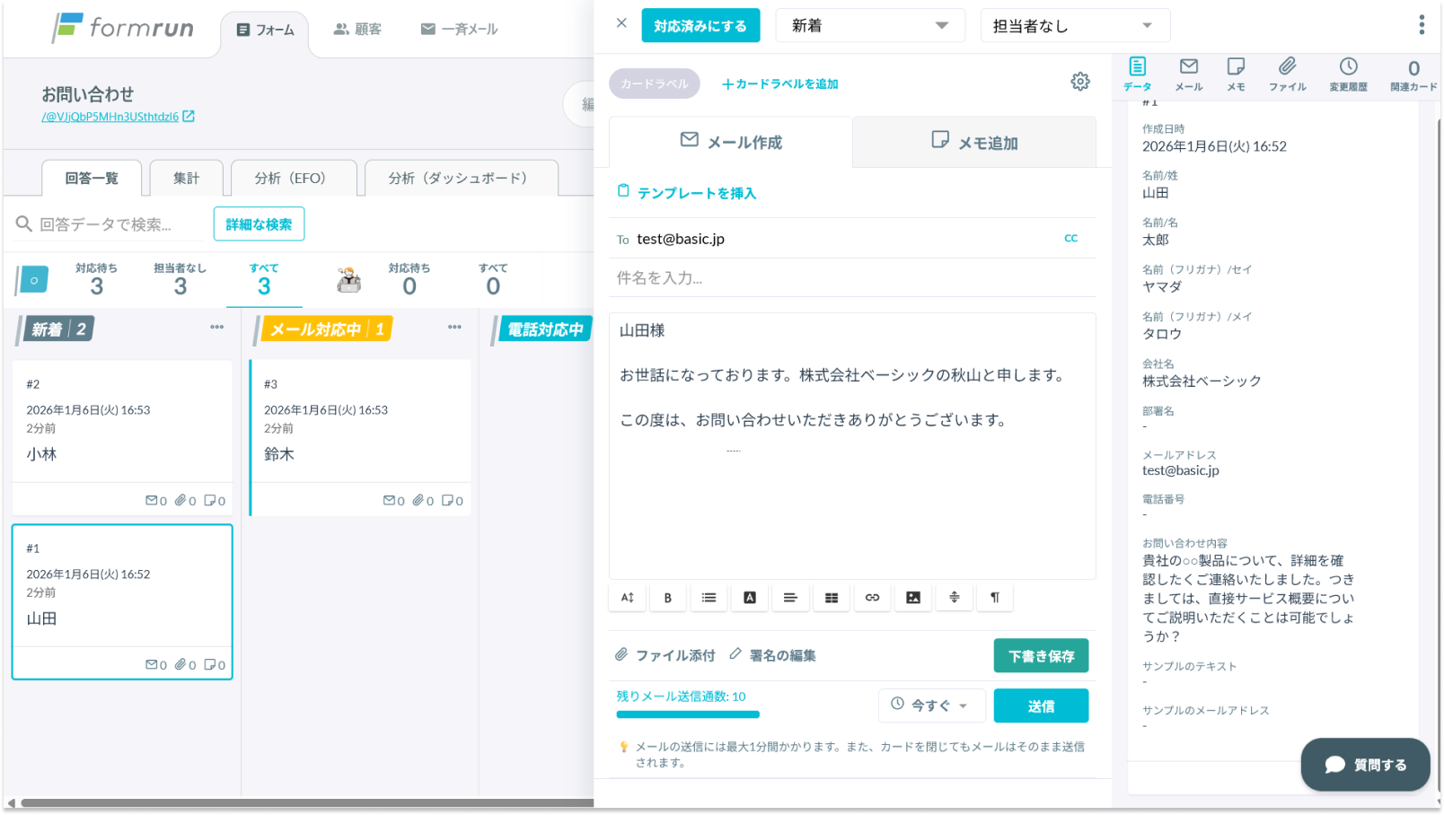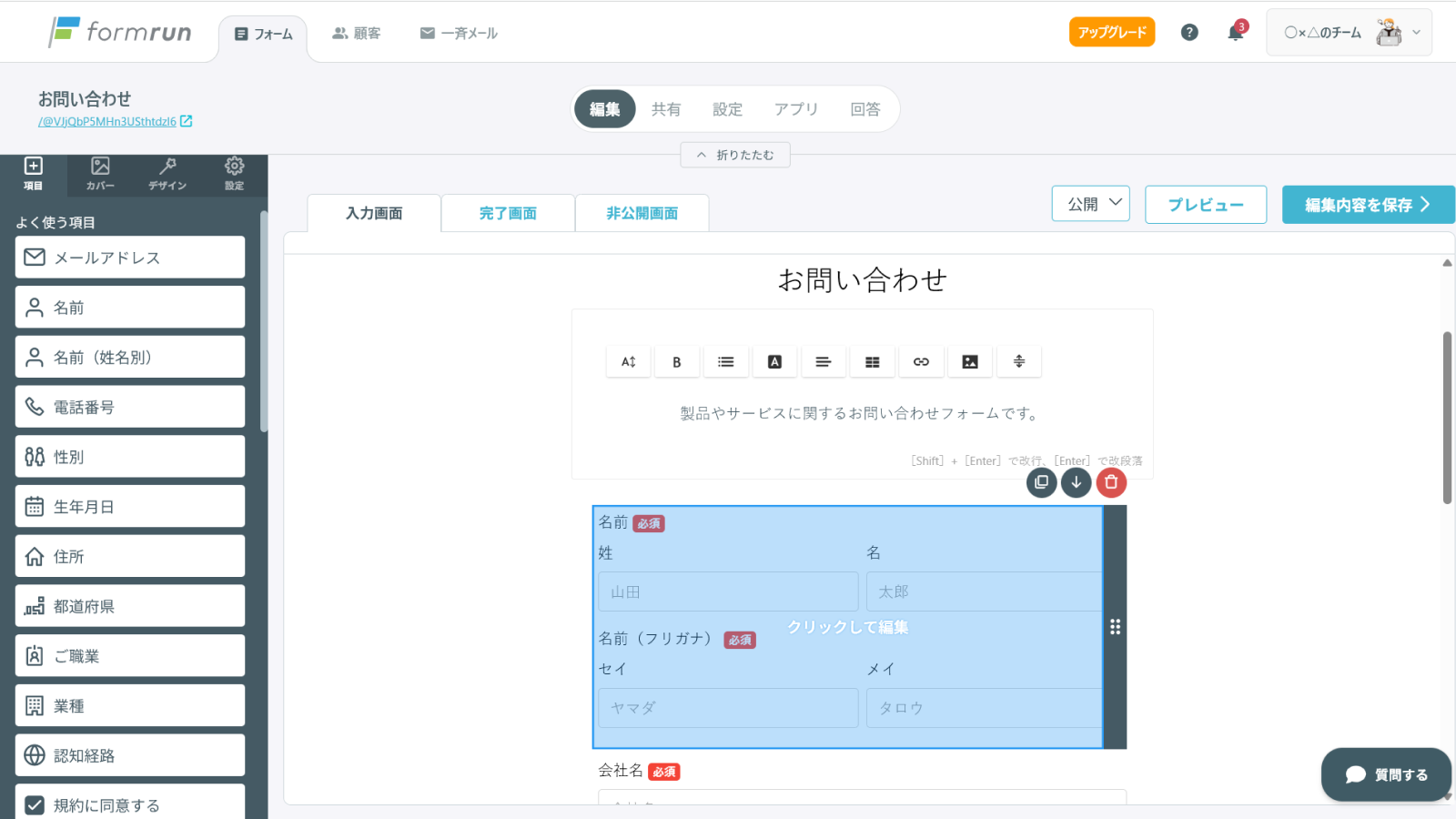 formrun(フォームラン)は、問い合わせ窓口やアンケートフォームなど、様々なフォームを作成できるツールです。誰でも簡単にフォームが作成でき、フォームの設置から問い合わせ対応状況の確認、メール対応まで、フォームに関わる業務を一元化しています。コードの設置をせずにフォームを作れるうえ、セキュリティにも優れており、個人情報の保護が重視される現代の企業が利用するのに最適です。