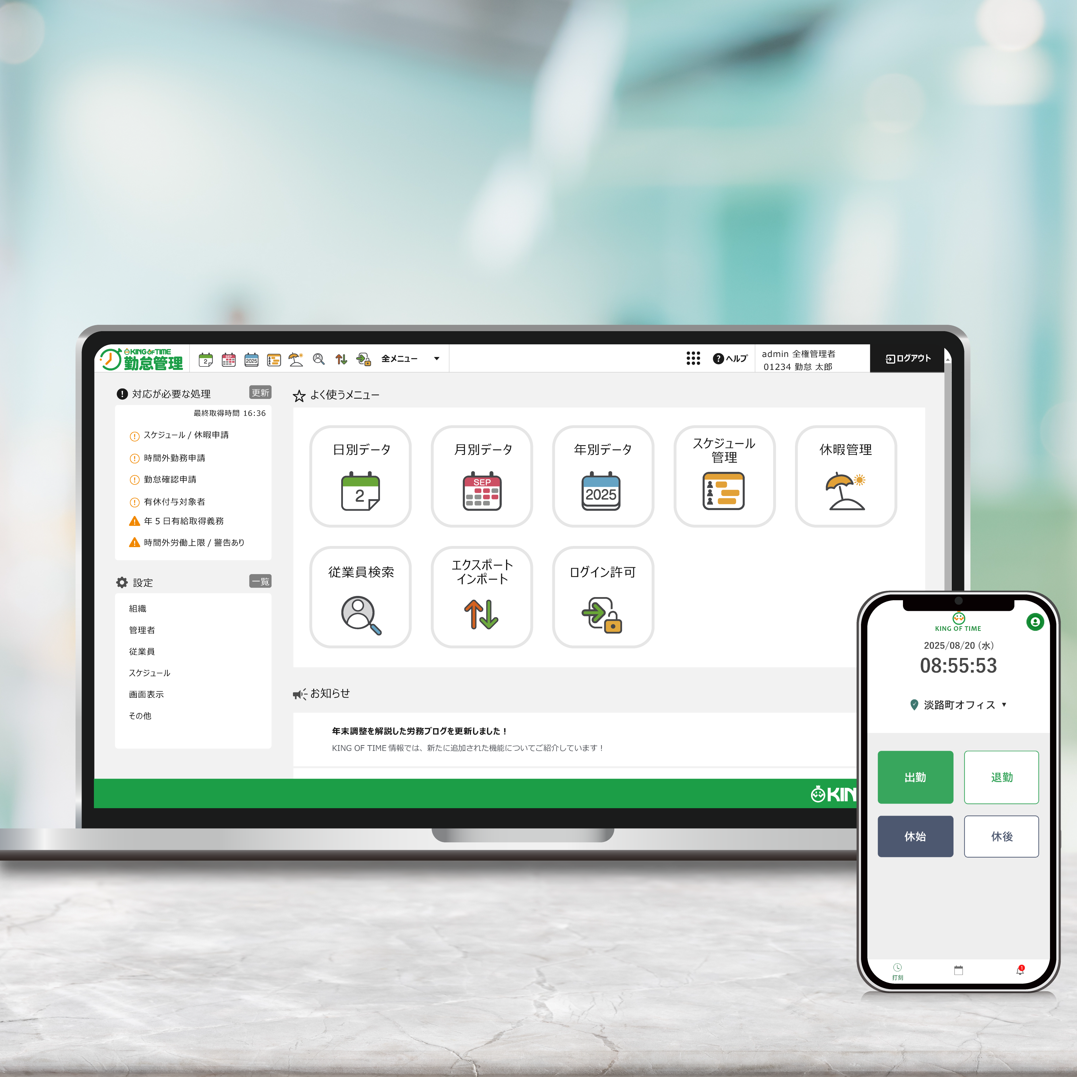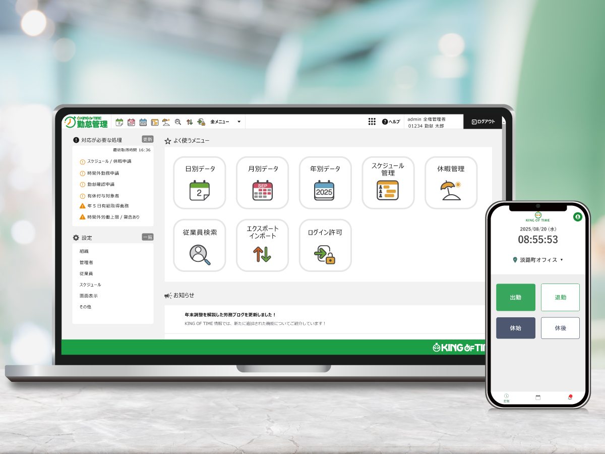 キングオブタイムはリアルタイム自動集計で大幅な業務効率化を実現する、市場シェアNo.1※のクラウド勤怠管理システムです。ICカードや生体認証、スマートフォンでのGPS打刻など多彩な打刻方法と、残業・休暇管理、申請承認など多様な働き方を支える豊富な機能を備えています。また、お客様の声や法改正への対応のための無償バージョンアップ(年3回)を行い、機能を拡充し続けています。さらに他のクラウドサービスとの連携も積極的に進めており、組み合わせ次第でお客様の利便性が無限に広がります。※富士キメラ総研「ソフトウェアビジネス新市場 2025年版」 勤怠管理ソフトSaaS/PaaS市場 利用ID数 2024年度実績 ベンダーシェア