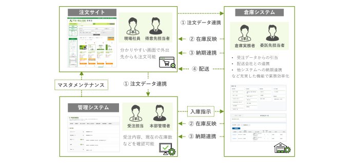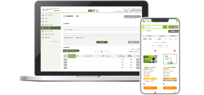 TS-BASE 受発注は、BtoB取引に特化したクラウド型受発注システムです。商品・備品・販促物などの受注から在庫管理・出荷手配までを一括でデジタル管理し、煩雑な業務を効率化します。「注文サイト」「管理システム」に加え、WMS機能を持つ「倉庫システム」をセットで利用できるため、受注から発送までを一つのサービスで完結できます。