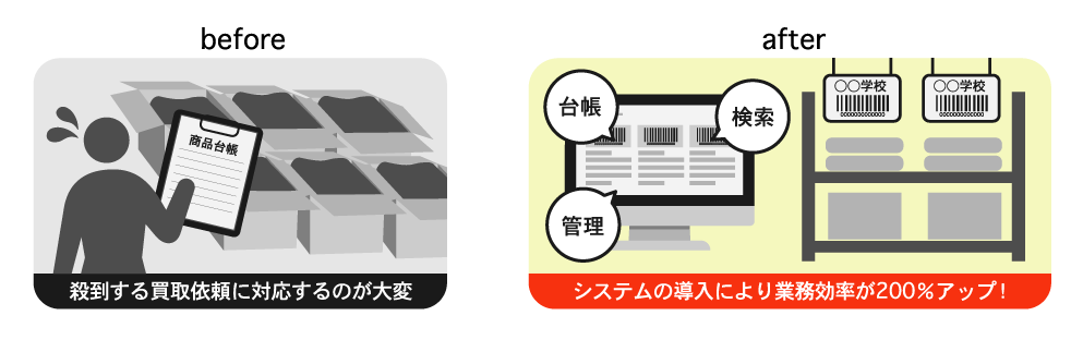 買取順に番号をつけて買取台帳を作成し、店頭に陳列できない商品はバックヤードに段ボールに入れて保管する方法で管理しようとしましたが、それだとお客様から「○○高校の制服はありますか?」と聞かれたときに、管理が商品番号順であるため学校ごとの検索に時間がかかってしまっていました。その上、候補の商品を台帳で見つけても、今度はバックヤードの段ボールの中から探し出すのに、さらに時間がかかる始末。お客様に迷惑をかけてしまう状況に「まずい」と感じ、再度よろず支援拠点に相談をしました。