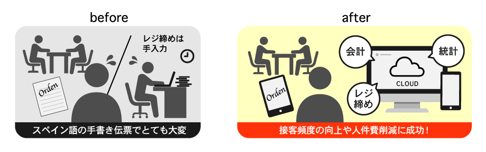 以前はオーダーが入ると、紙の伝票に手書きで、店員の名前、テーブル、時間、スペイン語の料理名、個数、金額を記載していました。スペイン語でオーダーを通すため、新入社員やアルバイトはまずメニューをスペイン語で覚えなくてはならなかったので、とても大変だったと思います。