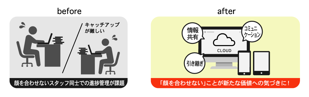 【課題】顔を合わせないスタッフ同士での進捗管理が課題に
