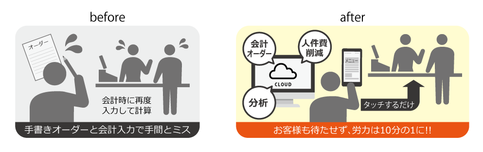お会計のお客様が重なるとレジ入力に多くの時間を割くことになるため、お客様をお待たせしてしまいますし、お会計対応でホールスタッフの人数が少なくなると、ご注文したいお客様をお待たせすることになり、結果的にどちらのお客様もお待たせしてしまう状況でした。」