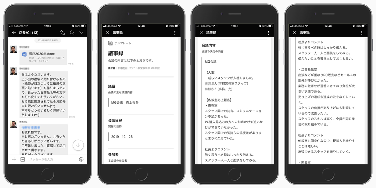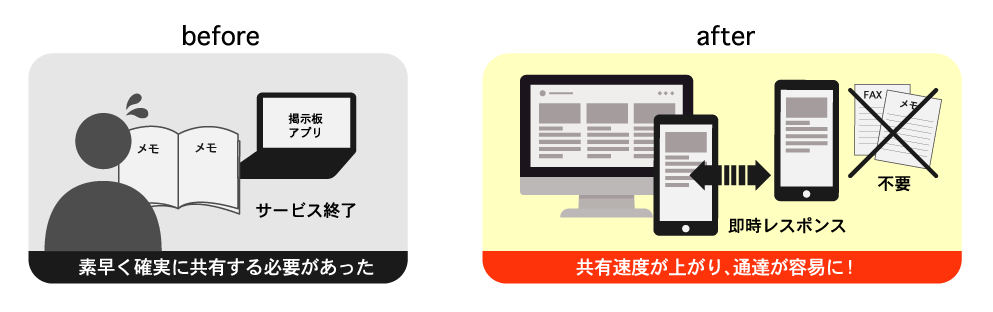 弊社のパソコンスクールは転校手続きなしで、どこの教室でも受講できるというサービスを提供しています。開業当初、教室・スタッフ間の引継ぎや情報共有はノートを使っていました。しかし、どうしても書き漏れなどが発生してしまい、多店舗での共有には無理がありました。そのため、全店舗で素早く情報の共有ができるチャットや掲示板ツールが必須となりました。当時、チャットは他社のものを利用していましたが、PCとスマートフォンの同期トラブルが多く、スタッフ間で問題になりました。また、チャットと並行して掲示板アプリサービスを社内情報の共有に使っていましたが、サービスが終了になるという通知を受け、掲示板機能を持った新しいツールを探すことになりました。