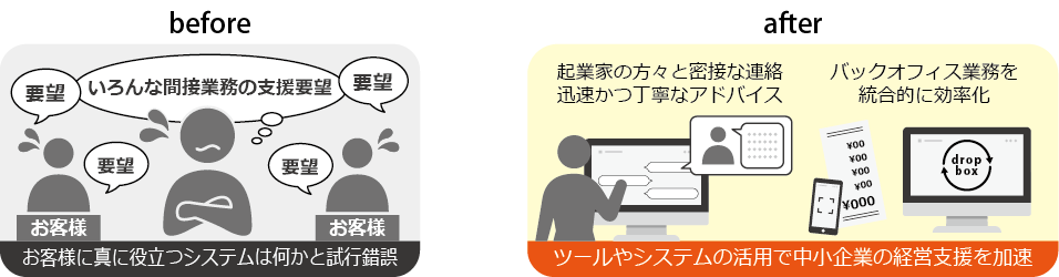 近年、お客様の経営サポートを通じて、新たな課題が次々に舞い込んでいます。たとえば、物品受領証のペーパーレス化、勤怠管理システムの導入など、ICT(情報通信技術)に関する問い合わせが増えている状況です。こうした課題に対して一つひとつ真摯に取り組み、解決を図っていくことで、企業の成長に貢献していきたいと考えています。