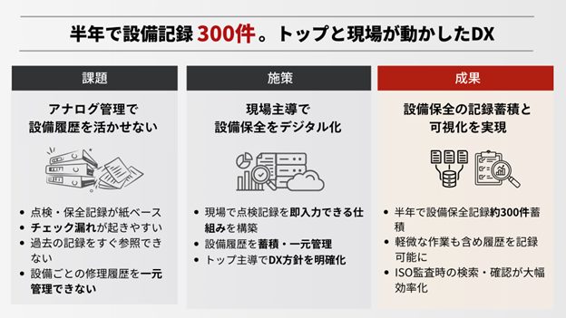 一方で、工場の日常点検や設備保全は紙ベースで管理されており、チェック漏れが起きやすいことや、過去の記録を必要なときにすぐに参照しづらいといった課題を抱えていました。特に、設備ごとの修理履歴を一元的に把握することが難しい状況でした。