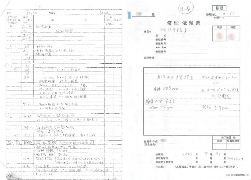以前は設備台帳が各部署にあり、修理内容も手書きで履歴を追えていましたが、ISO取得をきっかけに修理ごとに依頼書を出す運用に変わりました。その結果、依頼書は日付順には残るものの、設備ごとの保全履歴が分からなくなってしまいました。