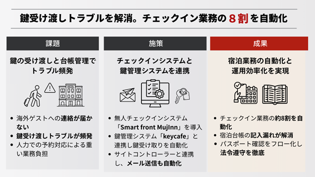 鍵管理システムkeycafeと無人チェックインシステムの連携で、業務の8割を自動化