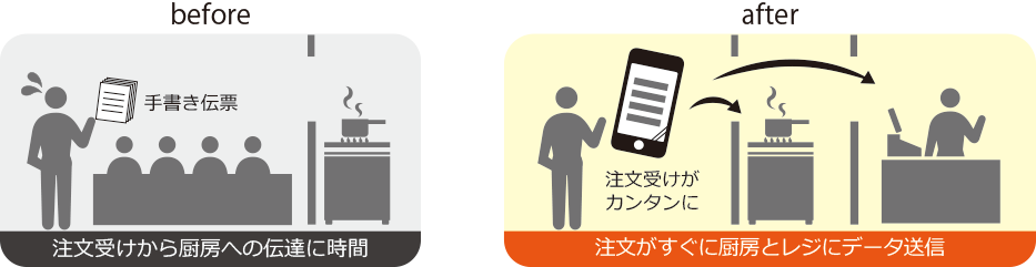 これは、スマートフォンに入れた専用アプリを通じて、お客様のご注文を入力すると、メニュー情報が調理場に自動的に流れる仕組みです。また、お客様にお出しする伝票も同時に印刷されるため、手書きの伝票を書く手間を省くことができます。こうしたメリットに加えて、月々のコストが安価な点も導入を決めた理由となっています。