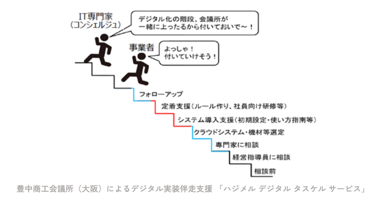 ただし自己変革の意欲はあっても、「何から始めたらよいか分からない」「どんなツールが自社に合うか分からない」といった壁が中小企業には存在します。そのため、デジタル化支援には、経営とIT技術に詳しい専門家やベンダー等に、事前相談からツール導入・フォローまで責任をもって一気通貫で相談対応してもらえる「伴走支援体制の構築」が不可欠でしょう。