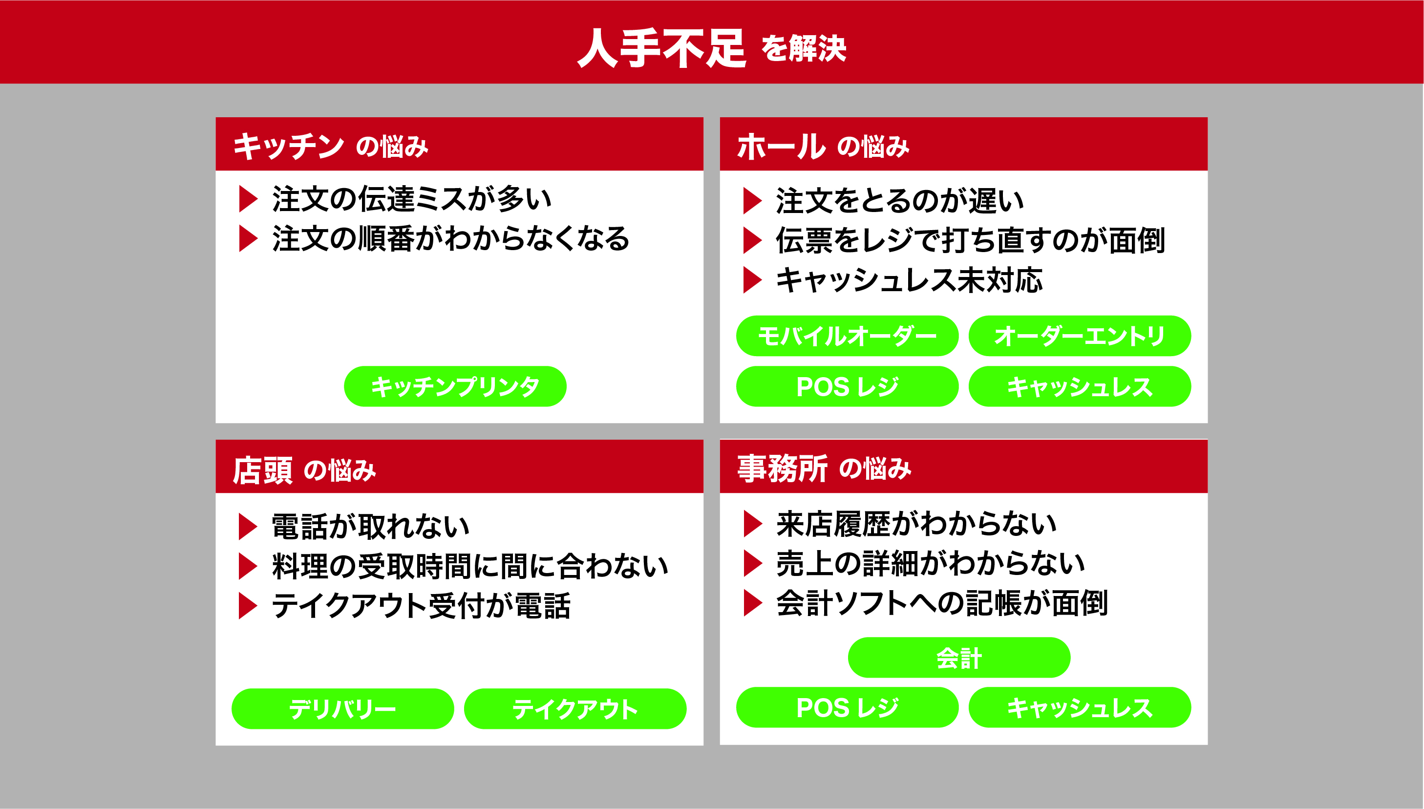 人手不足に起因して飲食店では多くの悩みが発生しています。ここではそれぞれの悩みにどのようにデジタルで対応していくかを考えていきます。