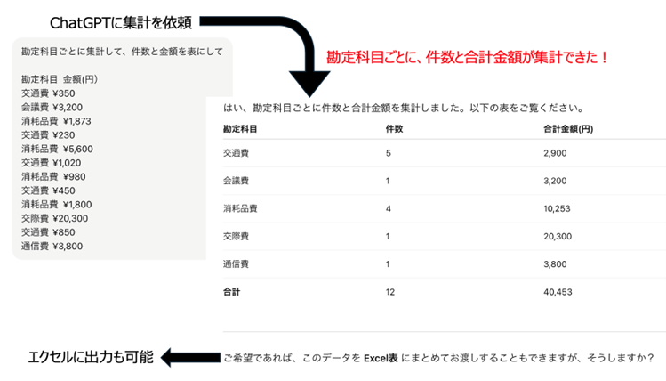 以下のように数値データを打ち込めば、集計もしてくれました。そして、エクセルに出力することもできます。