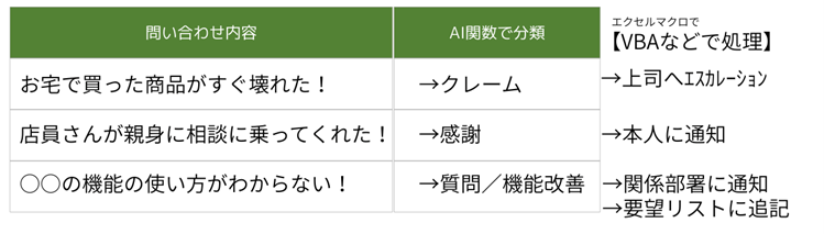 これまでは、問い合わせ内容を読んで人間が判断し、手作業で分類するしか方法がありませんでした。しかし、AI関数が表計算ソフト上で動作することで、こうした分類作業も自動化できるようになりました。たとえば、問い合わせ内容に応じて「クレーム」「感謝」「質問」といったカテゴリに自動で分類してくれます。