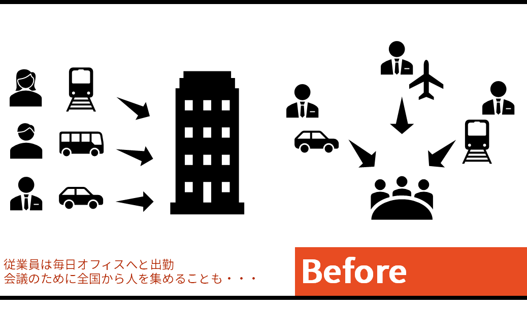 Web会議アプリの最も大きなメリットとしては、会って話すために人が集まらなくてよいというところです。これまで、仕事をすることと、通勤は、ほぼセットで捉えられてきました。首都圏では通勤ラッシュが常態化し、オフィスには従業員数以上の机と椅子が用意されており、みんな集まって仕事をすることが常識になっていました。また、多くの店舗や支店を持つ企業で、各拠点のマネージャーが定期的に集まって会議を実施し、場合によっては全国から一堂に会するようなこともあったかと思います。