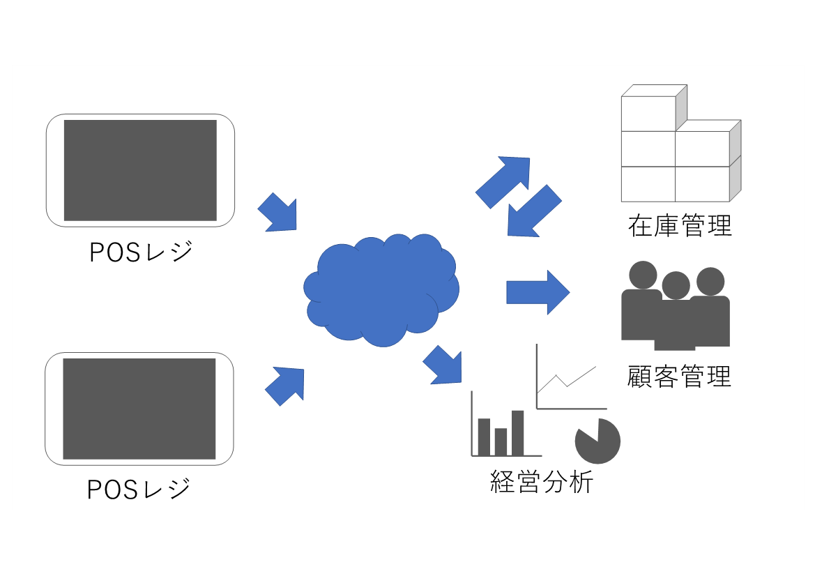 コンビニやスーパーなど、多店舗展開している場合にはそれぞれの店舗のデータを一か所に集約して分析する必要があるため、POSシステムがPOSレジを統括しているようなイメージになります。