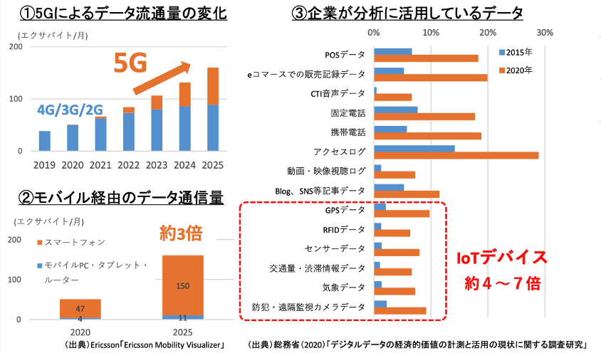 データ分析のニーズが高まっています。デジタル化の進展により、データ量自体が飛躍的に増加していることが一因です。「デジタルデータの経済的価値の計測と活用の現状に関する調査研究」(総務省2020)によると、5Gの導入、モバイル活用頻度の向上により、データは劇的に増えています。また以前まではデータ量がすくなかった、IoTデバイス経由のデータも今後更に増えていくことは間違いありません。