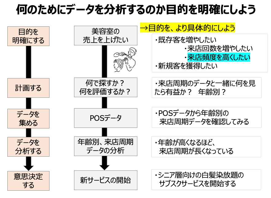 では目的を明確にするとはどういうことでしょうか。「当社は売上を上げたいという目的を明確に持って分析している」と言われる場合もあるでしょう。しかし、それでは目的が明確になったとは言えません。売上を上げるには、既存客を増やしたいのか、新規客を増やしたいのか、来店回数を増やしたいのか、来店頻度を高めたいのか、さまざまな要素があります。