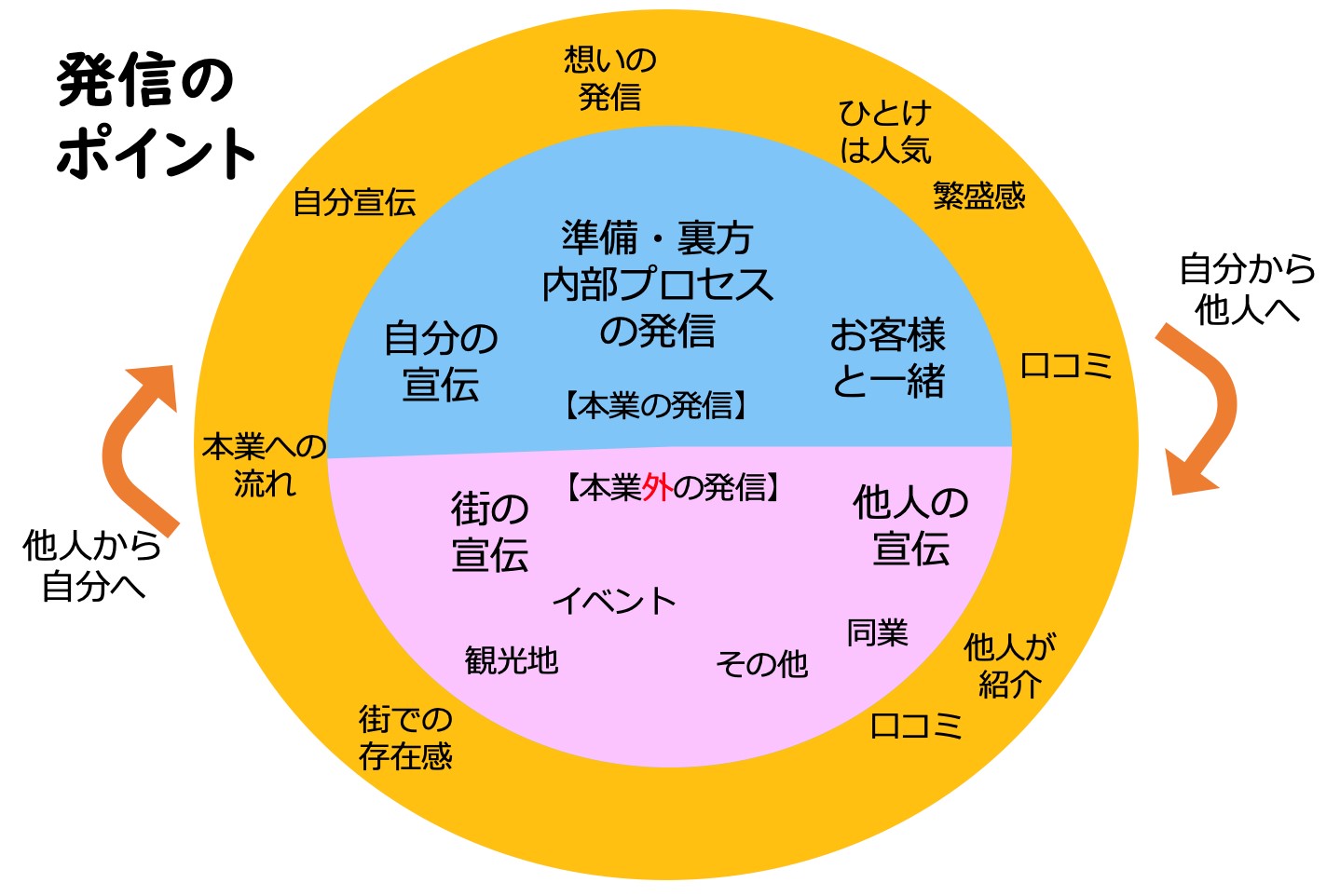 加えて、上記図表の下半分のような発信もできるといいのではないでしょうか。自分の発信をするだけでなく、近所の他のお店の発信や、地域の情報の発信です。上半分の発信は、あくまで自分のための発信です。一方で下半分の発信は他の人、地域のためのものです。これはまさに口コミになるわけです。