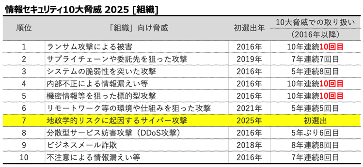 しかしその中で、初選出の脅威が登場しました。7位の地政学的リスクに起因するサイバー攻撃です。