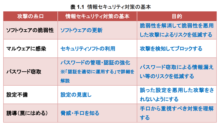 (出典)独立行政法人 情報処理推進機構「セキュリティ対策の基本と共通対策 情報セキュリティ10大脅威2025版」4頁 『表1.1 情報セキュリティ対策の基本』 https://www.ipa.go.jp/security/10threats/eid2eo0000005231-att/kihontokyoutsuu_2025.pdf