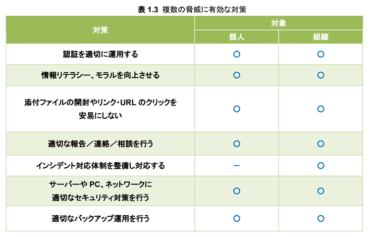 (出典) 独立行政法人 情報処理推進機構「情報セキュリティ対策の基本と共通対策 情報セキュリティ10大脅威2025版」5頁『表1.3 複数の脅威に有効な対策』 https://www.ipa.go.jp/security/10threats/eid2eo0000005231-att/kihontokyoutsuu_2025.pdf