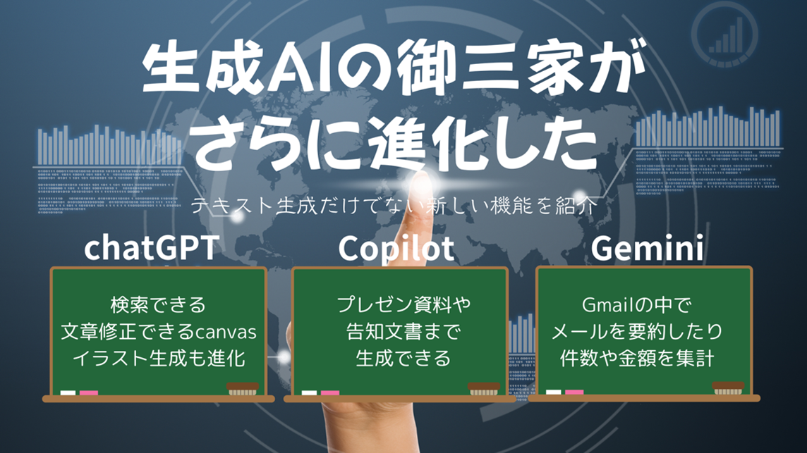 AIの研究は日々続けられており、AIの性能が競い合われています。それとともに、使いやすさの面でも多くの機能が改善され、より業務の中でスムーズにAIを活用できるようになってきました。今回の記事では、ChatGPTとGemini、Copilotといったメジャーな生成AIの進化した機能をお伝えします。