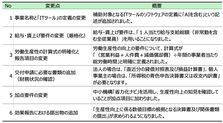 また、新たに「AI」が事業名に組み込まれました。昨今のAI技術の急速な普及にともない、今回事前登録されるITツールにおいても、AI関連のソリューションが増加することが予想されます。ただし、後述するように、AI分野が追加されたことによる制度上の大きな変更点は、現時点では見受けられません。