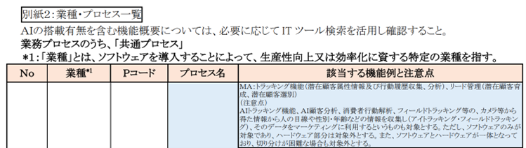 別紙2に「業種・プロセス一覧」にて業種ごと、プロセスごとにITツールの種別が分類されていますが、この内容に大きな変化はありませんでした。ここにAIに関するITツールの分類などが増えるかと思いましたが、現時点では増えていません。AIが含まれる内容は、2025年と変わらず、①顧客対応・販売支援の中の「AIトラッキング機能、AI顧客分析」だけでした。