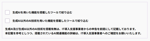 ただし、AIの搭載有無を含む機能概要については、必要に応じて IT ツール検索を活用し確認することと記載されており、ITツール検索の際には「生成AIを用いた機能を搭載したツール」及び「生成AI以外のAI技術を用いた機能を搭載したツール」を絞り込んで検索できるようになっています。