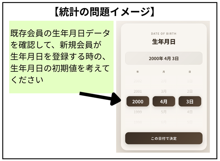 また、統計に関する問題も単なる計算問題ではありません。例えば、「Webサービスの会員登録で生年月日を入力する際、初期値が1900年1月1日のような遠い日付だとユーザーが不便に感じる」といった、日常的に遭遇するシーンを題材にしています。ユーザーの属性データに基づき、どのように初期値を設定するのが最適かといった「情報デザイン」の視点まで問われているのです。