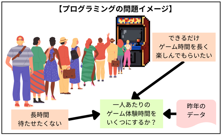 具体的には、体験型ゲームにおける「一人あたりの体験時間」を決定するプログラムを作成する問題などが出題されています。受験生は、与えられた複雑な制約条件を正確に読み解きながら、最適な処理手順を考えていく必要があります。