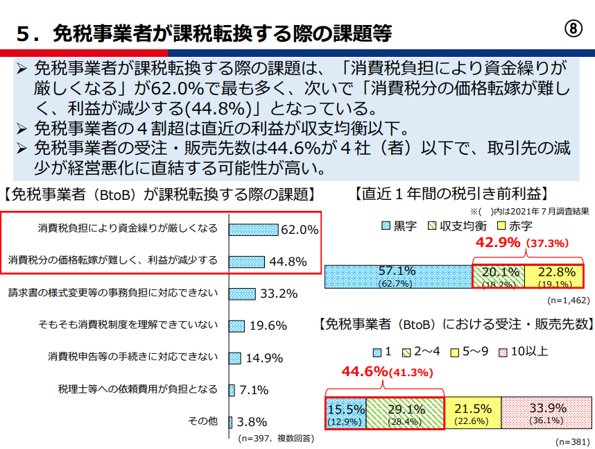 しかし、日本商工会議所が2022年9月に公表した調査結果によれば、免税事業者が課税転換する際の課題等は、「消費税負担により資金繰りが厳しくなる」が62.0%で最も多く、次いで「消費税分の価格転嫁が難しく、利益が減少する(44.8%)」となっています。また、「免税事業者の受注・販売先数は44.6%が4社(者)以下で、取引先の減少が経営悪化に直結する可能性が高い」とされており、免税事業者の多くは、課税事業者になった後、資金繰りや利益に影響を及ぼすことなく、数少ない取引先との間で、いかに今までと同じ取引を継続できるかを課題としていることが読み取れます。