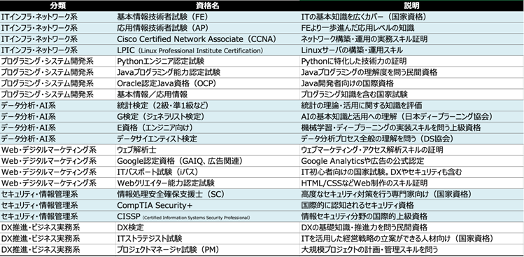 また、データ分析やAI関連の資格も注目されています。代表的な資格は以下の通りです。