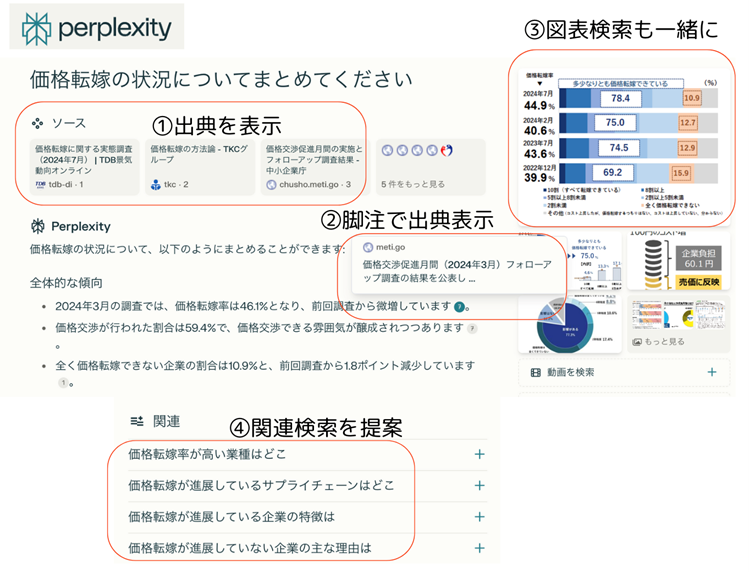 他にもこんなことを調べたらどうですか?と提案してくれます。今回の内容であれば、価格転嫁について、「転嫁率が高い業界は?」「価格転嫁が進展している企業の特徴は?」といった、追加で調べてみたい内容が提示されています。