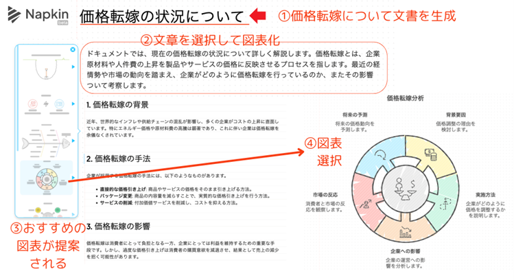 こちらにも①と同様に「価格転嫁」について聞いてみました。価格転嫁に関する文章が生成されたところまでは通常の生成AIと変わりません。ただ、②文章の一部と選択して図表化をお願いすると、③おすすめの図表候補が出てきます。
