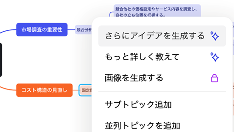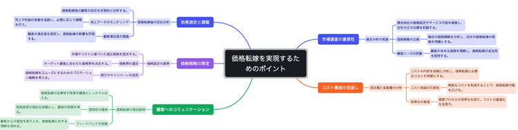 「価格転嫁を実現するためのポイントを整理して」と聞きました。そうすると、「市場調査の重要性」「コスト構造の見直し」「顧客へのコミュニケーション」「価格戦略の策定」「効果測定と調整」といった項目が提示されて、それぞれのポイントが配下に表示されています。