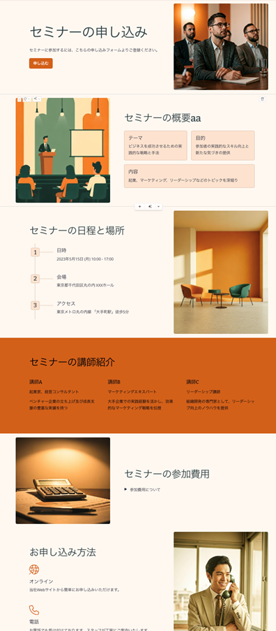 そんな中、登場したのがGamma(https://gamma.app/)です。試しに「セミナーの申込サイトを作って」と依頼しました。すると、ホームページの項目が提示され、その内容に従って、写真やデザインも提示されました。