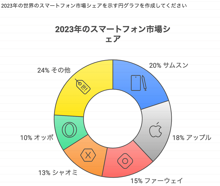 また、数値データからのグラフも作成してくれます。「スマートフォンの市場シェアを円グラフにしてください」とお願いすると、以下の図表となりました。(※シェアの数値は調査によってばらつきがあったため、検証が必要と思われます。以下に掲載した図表のシェア数値については未検証です。)