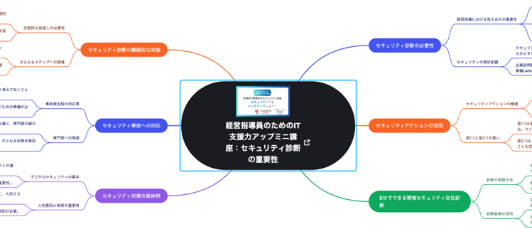 他にも、動画のURLを伝えると、動画の内容を分解してポイントを抜き出してくれます。例として、ここからアプリの経営支援力アップミニ講座「セキュリティ診断の重要性」について分解してもらいました。動画を見なくても動画概要が詳細に把握でき、動画内容の把握に役立ちます。実際に動画を見ながら、このツリーに自分のメモを追記していくとさらに理解が深まるのではないでしょうか。