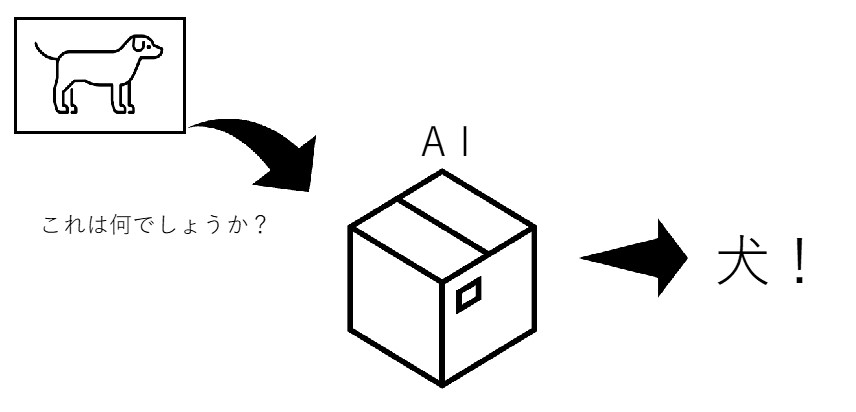 このように、少し前では考えられなかったサービスを実現しているAI。一体、どのようにできているのでしょうか。ここでは専門的な話は置いておき、ごくごく簡単に仕組みを紹介します。AIは簡単に言うと「箱」です。何か情報をインプットすると何かしらのアウトプットを得られる、そういうものです。例えば犬の写真を見せると「犬」という返答が返ってくるといったものです。