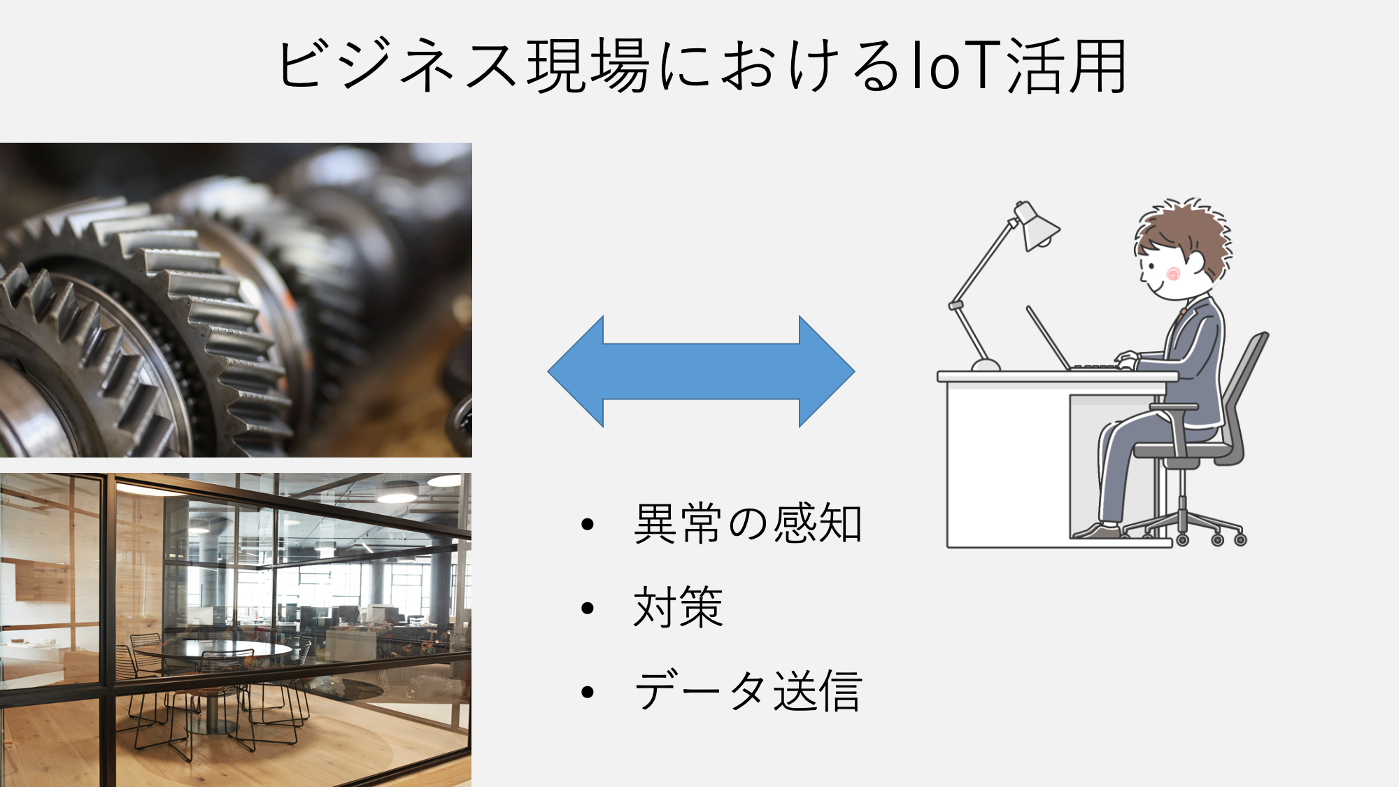 ビジネスでの活用についてはどうでしょうか。ビジネスでも同様に、実現できることは①遠隔監視②遠隔操作③データのやり取りの3つです。
