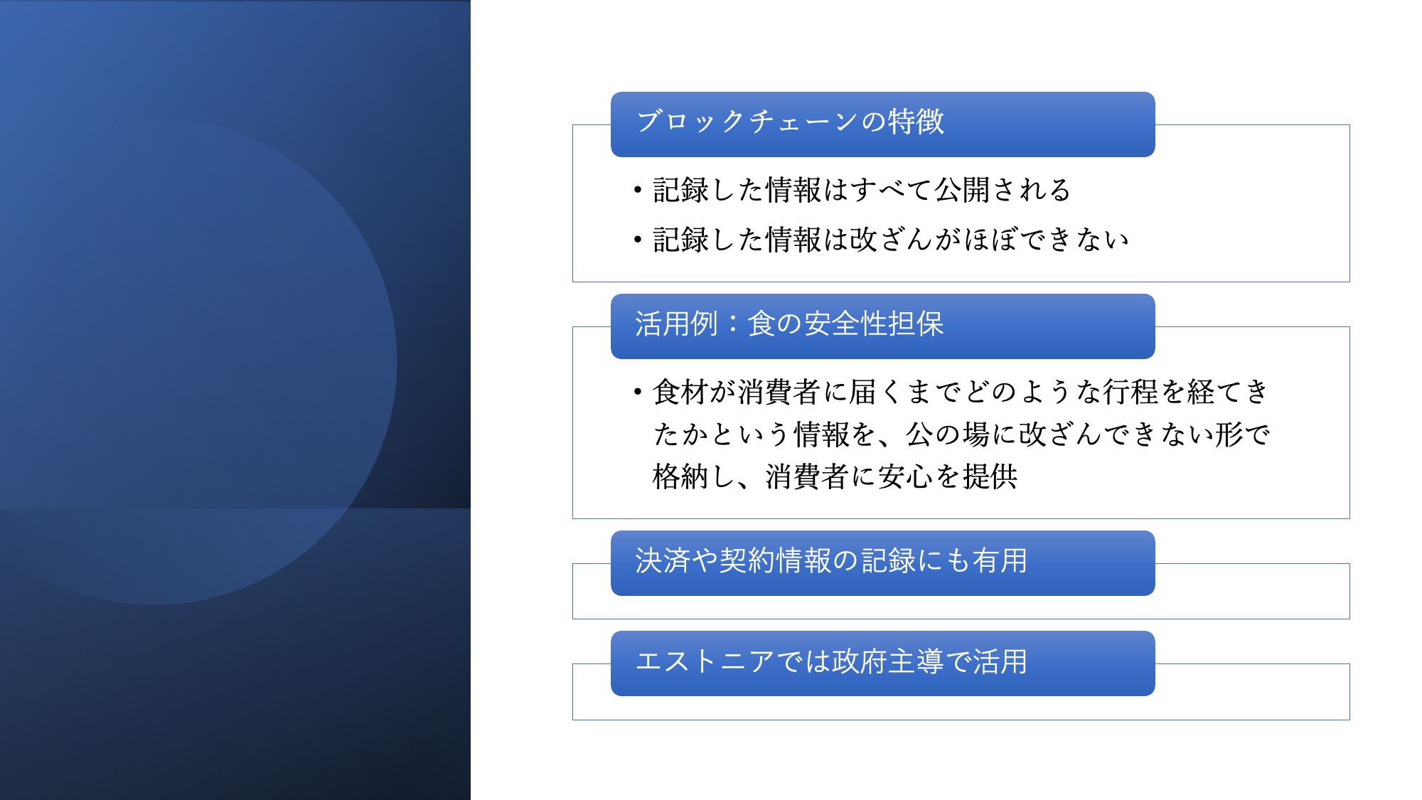 もちろん決済や契約情報の記録にも有用です。エストニアという欧州の国では、政府が主導し、ありとあらゆる取引データをブロックチェーンで記録するという取り組みをしています。選挙情報に活用しようという動きもあるそうです。