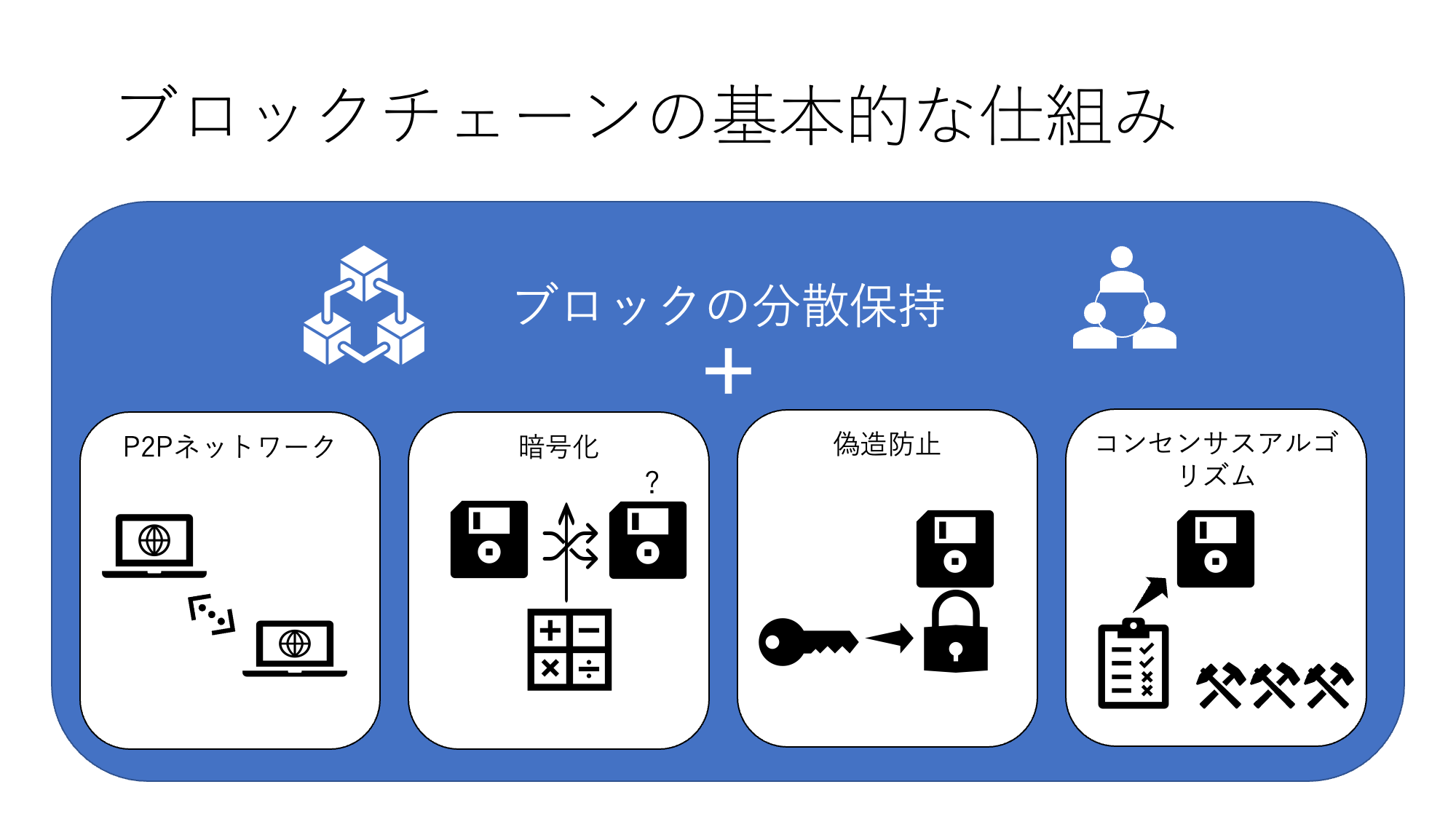 では、ブロックチェーンはどのような仕組みで「透明さ」を実現しているのでしょうか。ベースにあるのは情報を「ブロック」にして「分散保持」するという仕組みです。その上に様々な仕組みを盛り込んでいるのですが、ここでは主要な4つの仕組み「P2Pネットワーク」「暗号化」「偽造防止」「コンセンサスアルゴリズム」を紹介します。