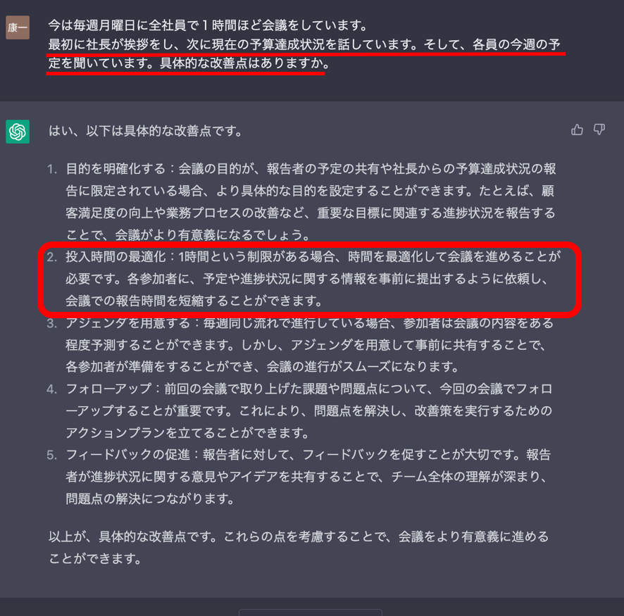 Chat GPTはこの後もどんどんと会話を続けることができます。ですので、例えば、会議が上長の一方的な通知になっているのが気になる場合、「フィードバックの促進が気になります。現状は上長の発言がほとんどで、メンバーの発言が少なく会議が活性化しません。」などと送信することで、それに合わせた回答がまた返ってきます。