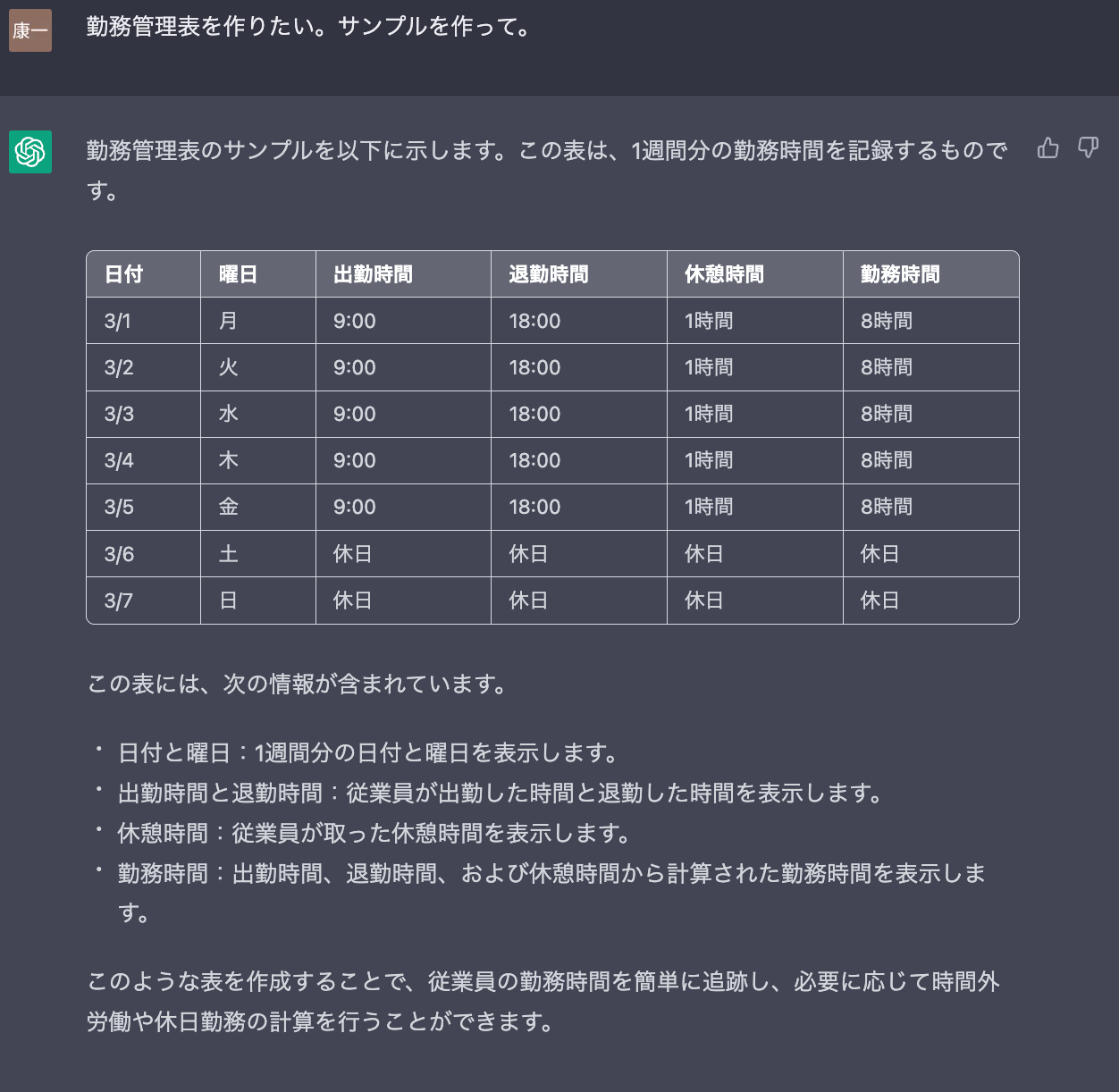 さらに、「残業や有給休暇にも対応したい。」などと送信することで、項目を増やしたサンプルの提示も期待でき、幅が広がります。ChatGPTの活用が進めば、人の手で「最初から」何かを作成するという業務そのものが、本当に希少になるかもしれませんね。