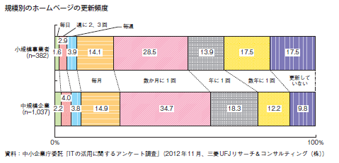 中規模以上の企業では、ほとんどの企業が自社ホームページを持っています。一方で、小規模企業の中ではホームページを開設していない企業も多くいます。また、ホームページを開設した企業の中には、とりあえず開設したけど更新していない企業も数多くいます。